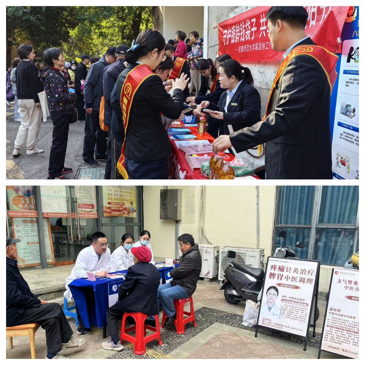 10月29日重阳节,离退休工作处分两个校区向全校近1600名离退休老同志发放重阳节慰问品;同时联系徽商银行芜湖分行、海螺医院分别开展“守护银龄钱袋子,共享金秋重阳节”反诈骗宣传咨询活动、免费义诊活动;开展走访慰问,积极解决老同志实际困难,协同学校有关部门,开展“快递到家”上门行动,为高龄退休教职工及行动不便的老年人提供免费送快递上门等服务。此外,与三子发艺协商,为离退休老同志提供长期免费上门理发活动。离退休工作处还将开展旅游信息发布,校退教协、关工委成员外出学习,走访慰问离退休老同志等活动。学校各学院、各单位也开展了丰富多彩的关爱老同志活动。