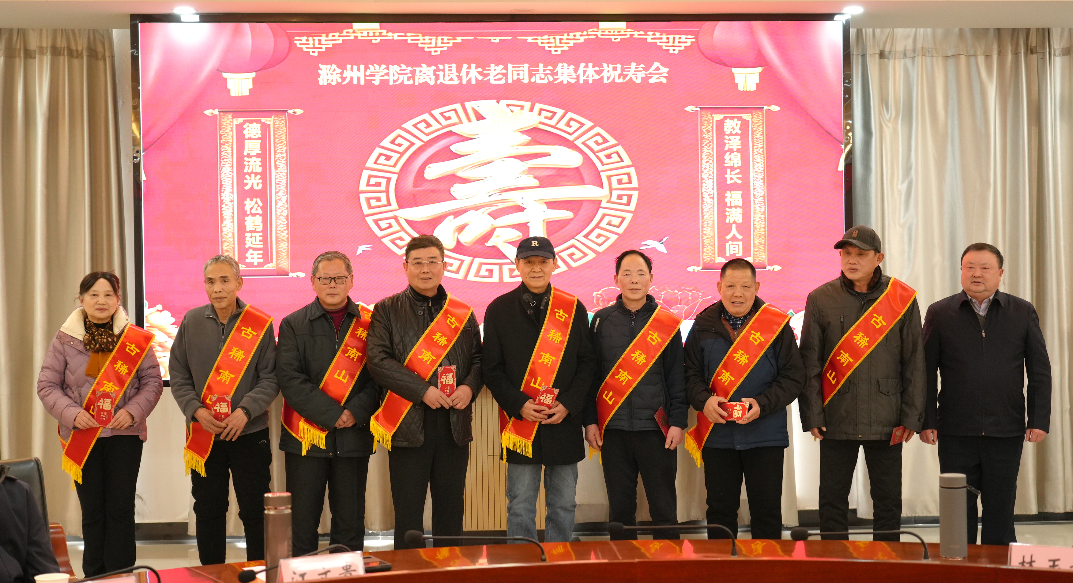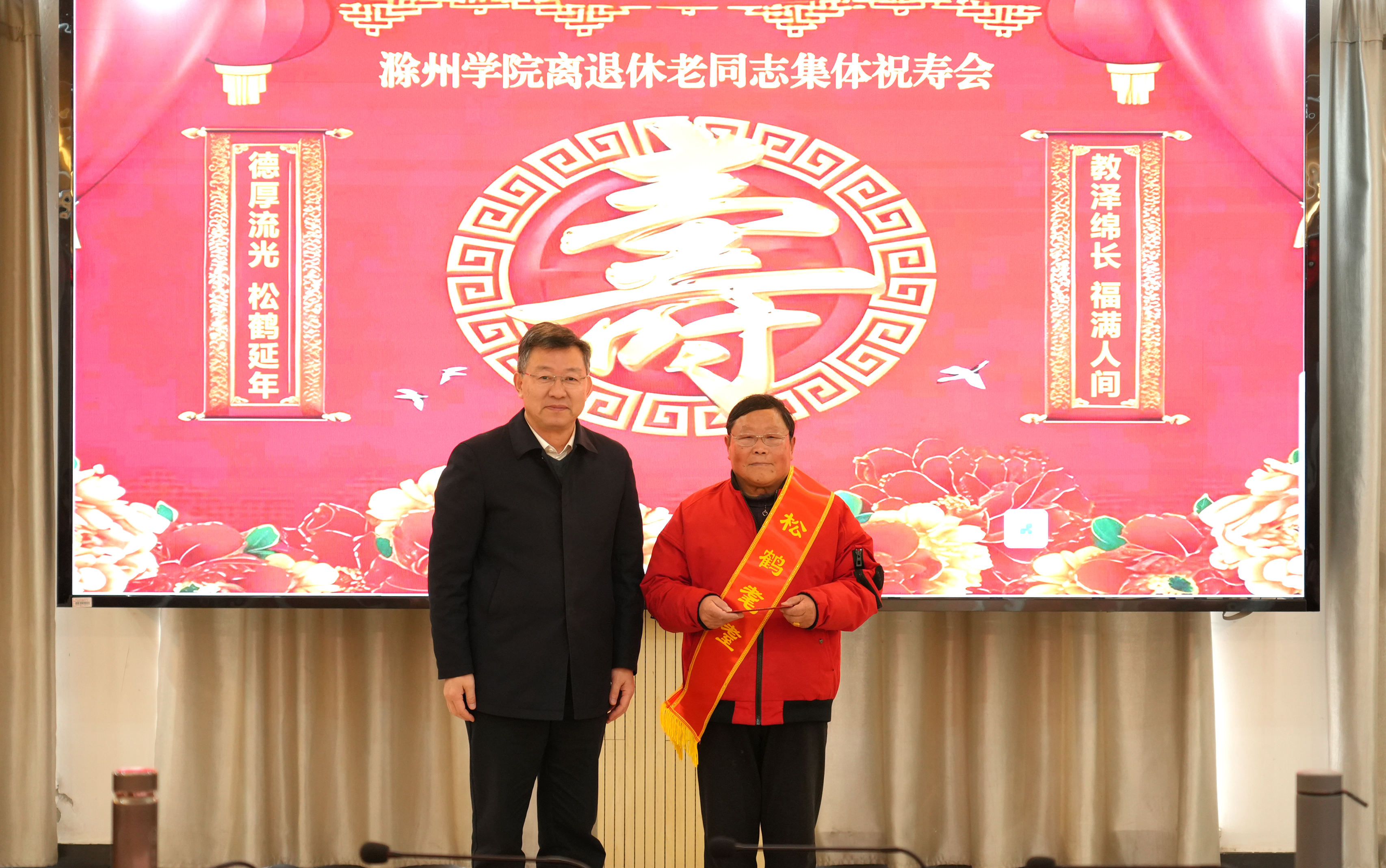会上为2025年年届七十、八十整寿的老同志举行了集体祝寿活动,校领导为寿星们佩戴绶带、致以美好祝福。
